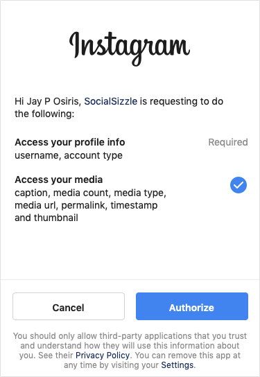 - Victim authorize the third-party Instagram application and accept to give basic permissions like user_profile